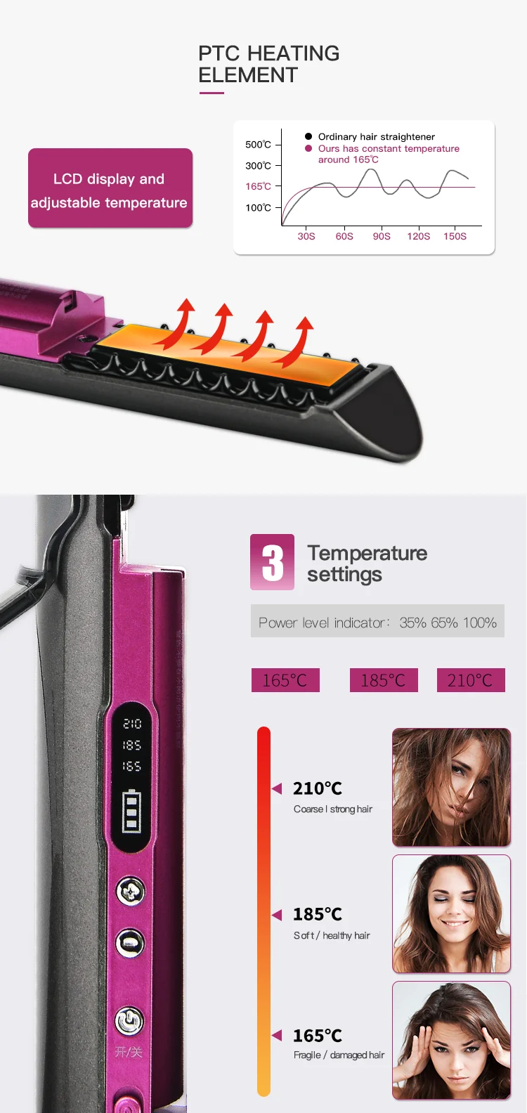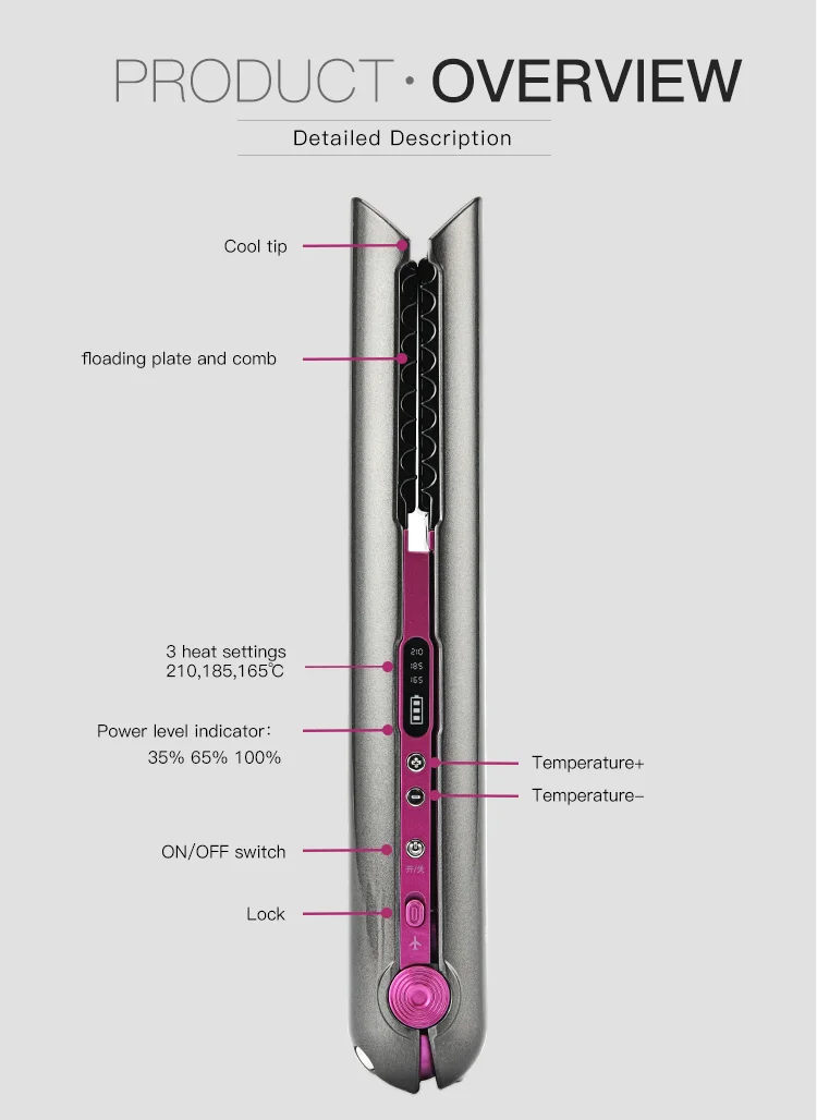 temperature display, battery usage, multi-temperature degree, Auto power-off protection, dual wet and dry, Negative ion
